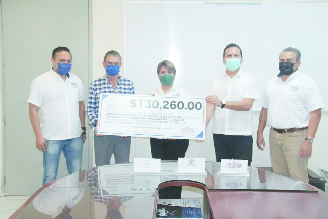 COZUMEL.– Un total de 130 mil 260 pesos que servirán para 167 becas de educación superior, fue entregado por directivos de la Fundación Cozumel a la directora de la División de Desarrollo Sustentable (DDS), Lucinda Arroyo Arcos, quien se acompañó del personal de la admi- nistración universitaria.