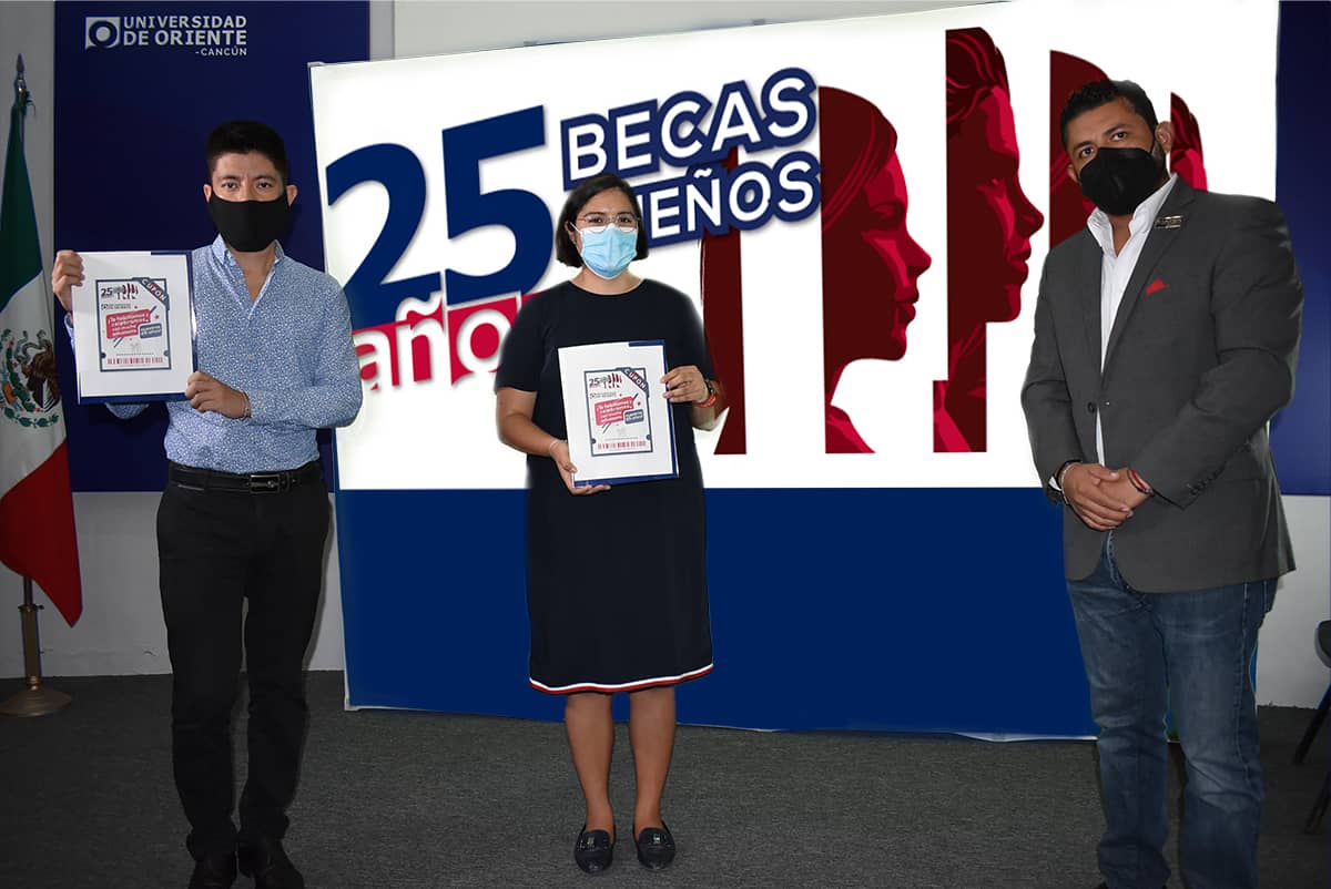 CANCÚN.- Con motivo de la celebración de su vigésimo quinto aniversario, la Universidad de Oriente Campus Cancún, por conducto del Rector Eduardo Trejo Domínguez, entregó becas del 100% para estudios de maestría a profesionistas de la comunidad quintanarroense que por su destacado desempeño y vocación en el ámbito de investigación y emprendimiento, fueron seleccionados tras haberse inscrito en la convocatoria de dicho programa; haciéndose acreedores a tan importante reconocimiento y apoyo académico de nivel posgrado.